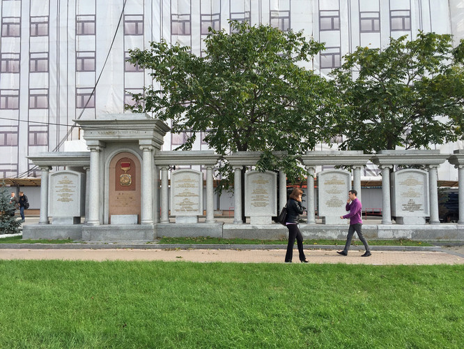 广场一侧的一座建筑(导游告为广播电视机构),墙上有各种军功章的雕塑和原苏联15个加盟共和国的国徽雕塑,以及对这些勋章、国徽的文字介绍。