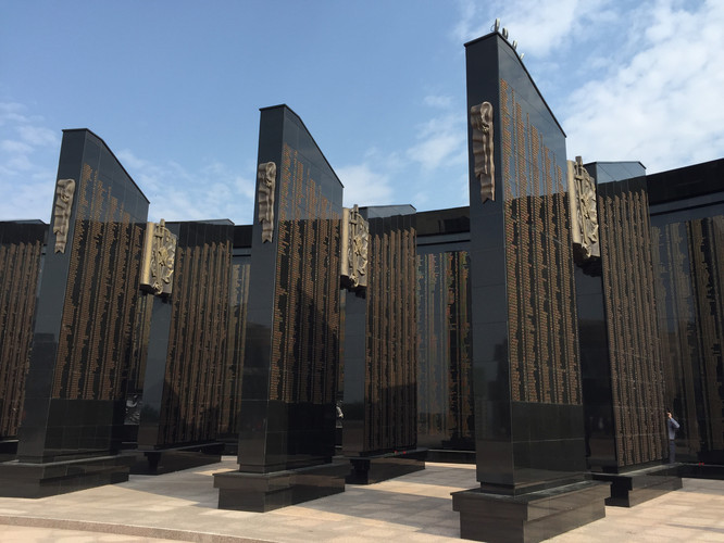 烈士纪念碑气势雄伟,居中是一块红色花岗岩,两旁伸展开的黑色大理石碑身上刻着烈士们的名字,中间地面上的圣火一直在燃烧。