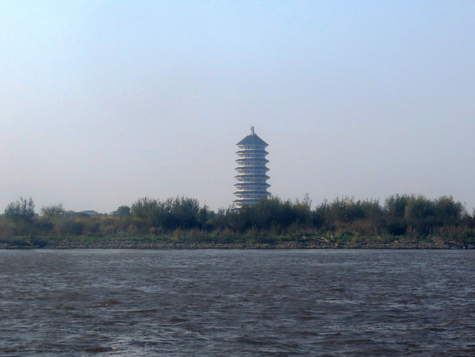 东极宝塔,黑瞎子岛上的地标性建筑。位于岛东部极角,宝塔采用八角形塔身,汉唐风格,塔高9层81米。宝塔设太极图案圆形广场,广场直径171米,代表黑瞎子岛回归的171平方公里领土;广场两个极点分别布设龟和麒麟;广场布设60根青石盘龙浮雕柱,周边的56根代表中华56个民族,另有4根擎天精雕龙柱。
