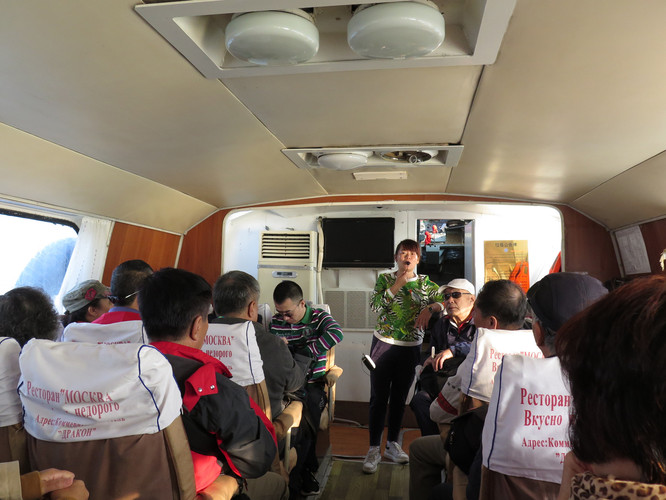水翼船不大,载客量45人,人不可出舱外,着绿衣、站立者为地接导游,东北口音,当地人。
